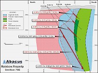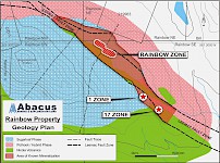 The Rainbow zone is a copper-gold mineralized zone favourably situated 3.5 kilometres southeast from the past producing Afton mill site, along the same structural trend that hosts the previously mined Afton, Pothook, and Ajax ore bodies. The mineralized body has a current strike length of 500 metres, a thickness range of 50-150 metres, and a steep southwest dip that has been traced for up to 500 metres below surface. The geometry of the deposit is roughly tabular with an east-west to east southeast orientation. There is excellent potential for expansion, along strike, down dip and at depth.