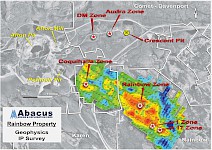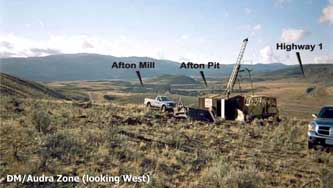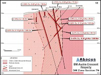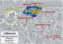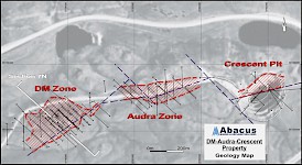 The western end of the DM-Audra-Crescent zone lies 1.5 kilometres east of the Afton pit and forms a 1.5 kilometre mineralized trend eastwards toward the junction of the Trans Canada Highway and the Coquihalla Highway. This mineralized trend lies within a 5 kilometre long structural corridor that extends from the Afton Deposit eastwards to the Big Onion deposit, near the Iron Mask industrial area. In the DM-Audra-Crescent area, this structural zone occurs mainly as strong gouge-rich fault which has a well-developed fabric. This fault zone separates the mineralized Cherry Creek monzonite intrusive phase on the north from the older Pothook phase to the south. In 2004, Abacus completed its first diamond drill program on the DM/Audra/Crescent trend. Over 11,300 metres of diamond drilling was completed and was successful in establishing continuity of mineralization between the DM and Audra zones. Drilling highlights in 2004 include drill hole DA-04-006 grading 0.42% copper, 0.26 g/t gold, and 0.08 palladium over 308.9 metres. Copper-gold mineralization at the DM-Audra Zone outcrops at surface, and varies from 20 metres to over 200 metres in thickness, at least 300 metres in depth along a strike length of over 1200 metres. The zone appears to dip steeply to the south.